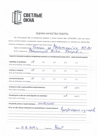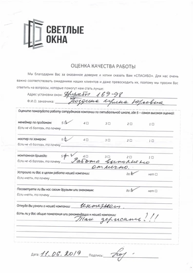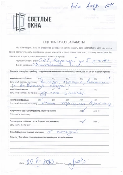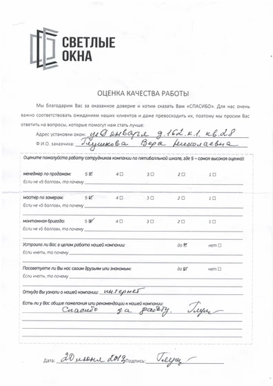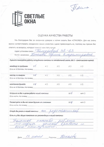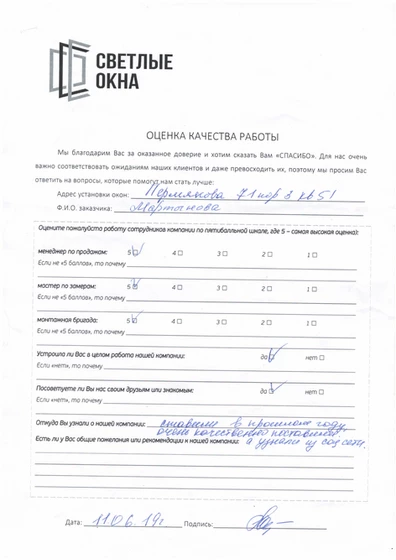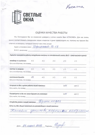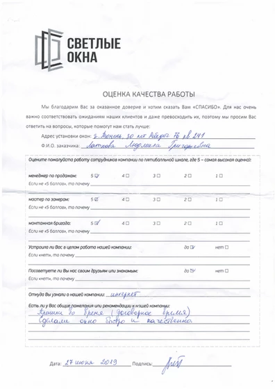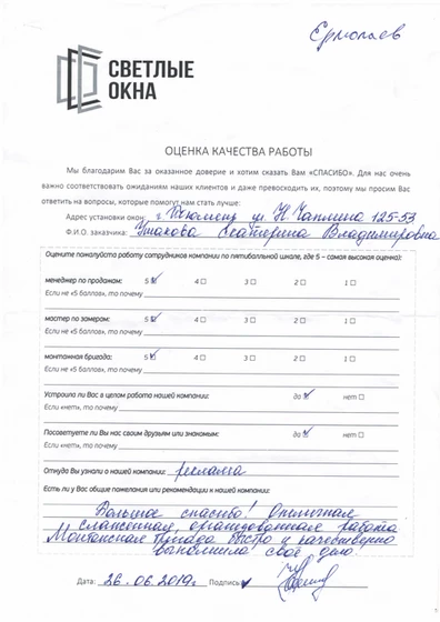 "Делали заказ в ООО «Светлые окна» год назад. Хотя у нас уже стояли пластиковые окна, буквально через 3 года нам требовалась их замена в детской: балконный блок продувался насквозь, окно закрывалось с трудом. Искали, где можно заказать пластиковые окна в Тюмени с быстрой доставкой и установкой, так и нашли ООО «Светлые окна». Замерщик предложил нам совсем другую конструкцию балконной двери, которая оказалась очень удачной. Отмечу менеджера, которая посоветовали подложить картон на пол, чтобы не повредитьего во время установки. Именно такие маленькие моменты выдают профессионалов. Если вам нужно заказать пластиковые окна, цена которых будет соответствовать качеству – вам в ООО «Светлые окна»."