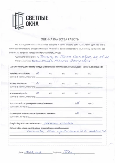 "Делали ремонт в квартире для дочки. Решили установить окна пластиковые, ведь в Тюмени без них очень невыгодно: из старых рам тепло утекает, и плата за отопление растет. Для нас, как для пенсионеров, было важно, чтобы в фирме были низкие цены, поэтому искали производителя. Выбрали продукцию завода «Светлые окна». Оказалось, что тут и вправду можно недорого купить наши российские пластиковые окна, а качество будет как у европейских. Все сотрудники фирмы очень доброжелательные и терпеливые, все подробно объясняли, любезно отвечали на все наши вопросы. Установили окна быстро и убрали за собой весь мусор. Дочка очень довольна – теперь у нее тепло."